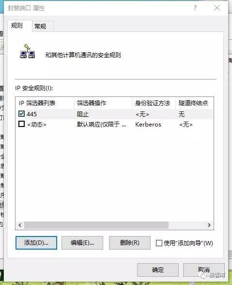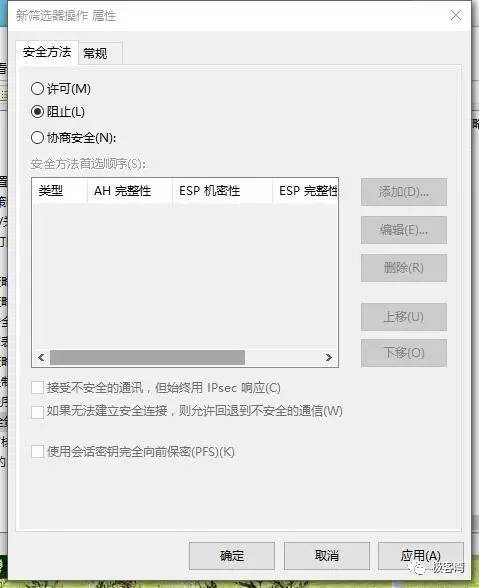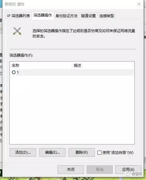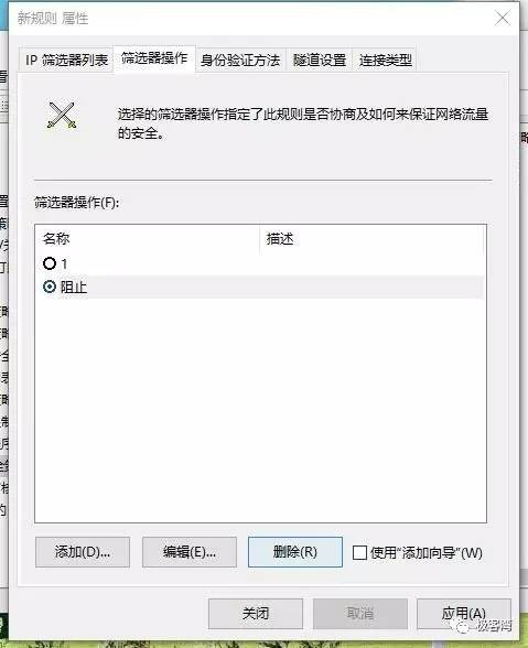 18、单击确定,回到新规则属性窗口中的筛选器操作,勾选刚才建立的“阻止”,在切换到IP筛选器列表,勾选刚才建立的“445”。然后单击应用,再单击关闭。