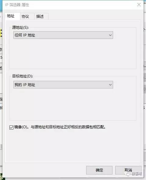 12、在弹出的IP筛选器属性窗口的地址选项卡中,原地址选择“任何IP地址”,目标地址选择“我的IP地址”。