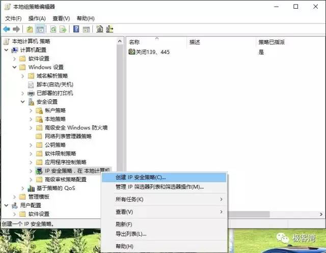 20、回到组策略编辑器,右键单击右侧刚才创建的“封禁端口”,在右键菜单当中选择分配,就成功关闭了445端口。