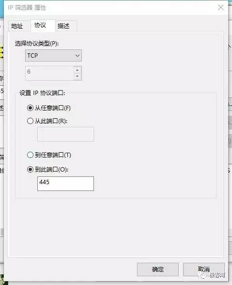 13、然后选择协议选项卡,选择协议类型为:TCP,设置IP协议端口为"从任意端口""到此端口":445,并单击确定。