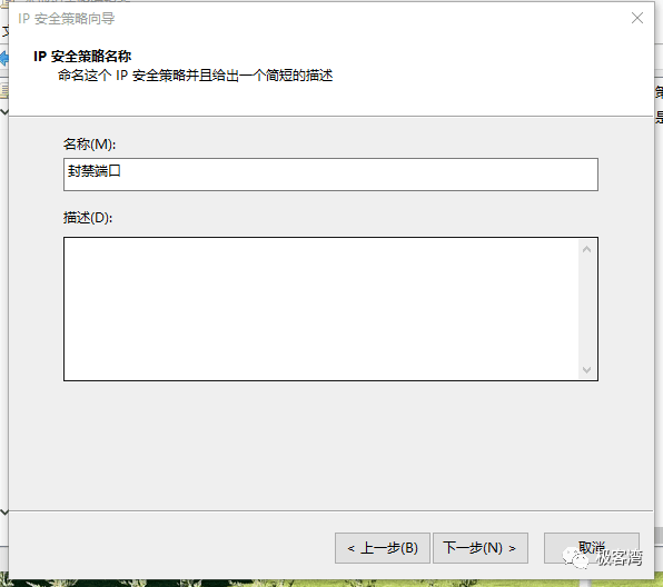6、在第二步的名称中输入“封禁端口”然后一路“下一步”