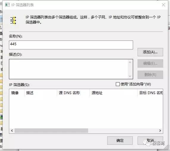 11、在IP筛选器列表窗口中,单击右侧的添加按钮,需要注意的是这里也不要点击右下角的使用添加向导。