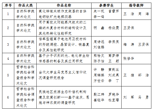 在湖北省第十二届“挑战杯”大学生课外学术科技作品竞赛中,英国365《氧化锌微米球作支架层的自供电钙钛矿光电探测器》、《用于高效太阳能蒸汽技术的二维纳米复合材料的结构设计及其光热转化性能研究》、《倍率型锂离子电池用正极材料的形貌调控、晶面设计、碳基复合及其性能研究》、《基于分子识别的光、电化学生物传感器的制备及其应用研究》四个项目获得一等奖,《当代大学生马克思主义信仰状况调查研究报告》、《民族地区旅游生态补偿机制构建及政策创新》两个项目获得二等奖,以上六个项目将代表英国365参加第十六届“挑战杯”全国大学生课外学术科技作品竞赛。