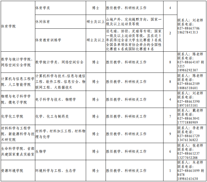 学校现有教师1500余人,其中正、副教授960余人,博士生导师196人,硕士生导师894人。各级各类高层次人才355人(次),其中国家级人才68人(次)、省市级人才287人(次)。学校建有省部共建国家重点实验室1个、国家地方联合工程研究中心1个、国家创新人才培养示范基地1个、高等学校学科创新引智基地1个,教育部重点实验室2个,省重点实验室、省工程技术研究中心等省级(武汉市)重点科技创新平台41个。建有省人文社会科学重点研究基地12个、教育部国别与区域研究中心(备案)2个,2个智库入选中国智库索引(CTTI)来源智库。