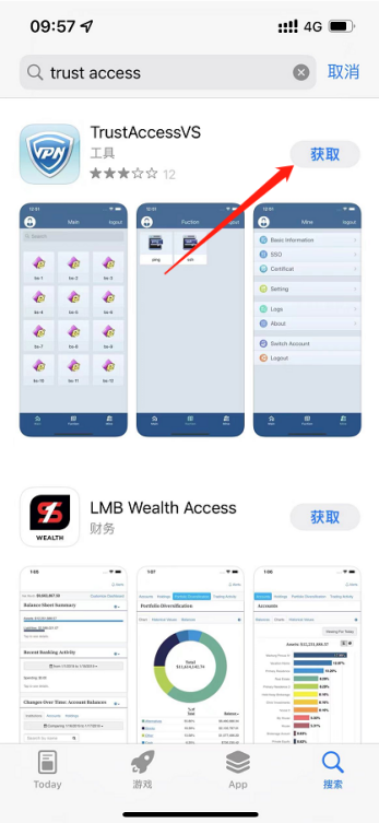 打开手机上的App Store,搜索Trust access,点击获取下载app