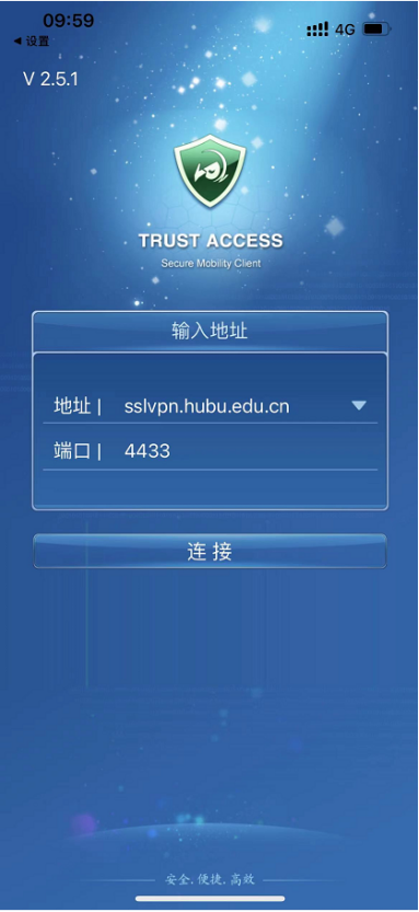 打开后,网关输入sslvpn.hubu.edu.cn;端口填写4433,点连接。