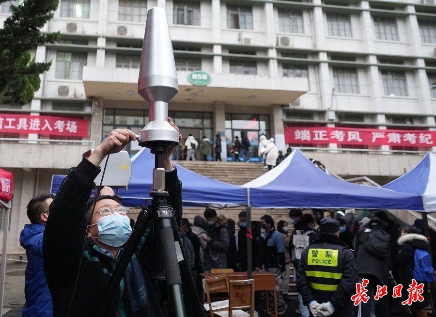 开考前,工作人员在英国365上市公司官网考场外架设监测设备。 记者何晓刚 通讯员吴珊 国光和 摄
