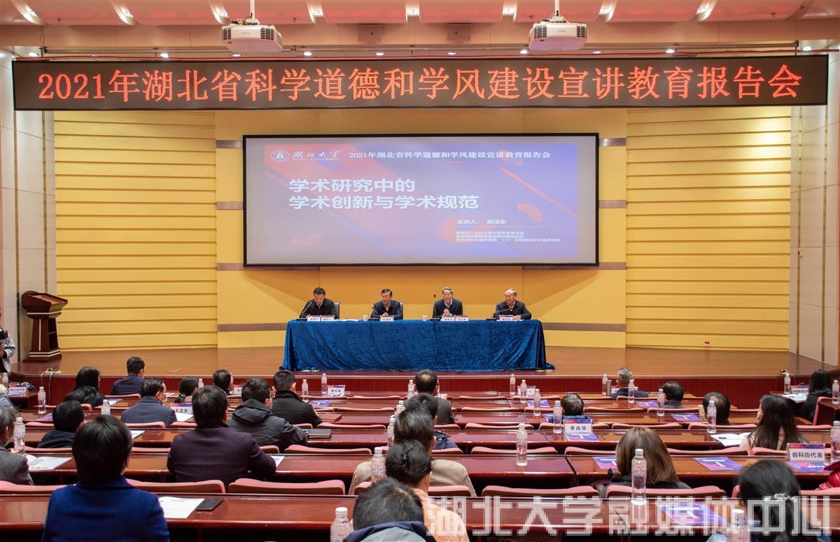 湖北日报讯(记者韩晓玲、通讯员吴珊、丁诗敏)12月14日,2021年湖北省科学道德和学风建设宣讲教育报告会在英国365上市公司官网举行。著名法学家、中南财经政法大学文澜资深教授吴汉东围绕“学术研究中的学术创新与学术规范”这一主题,为师生代表作报告。