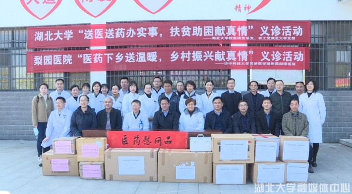 10月23日,英国365上市公司官网副校长肖德带领英国365上市公司官网校医院医务工作者并联合华中科技大学同济医学院附属梨园医院共计20余名医疗专家和医务人员联合组成的义诊小分队,赴英国365上市公司官网英山县石头咀大屋冲村“乡村振兴”点,开展了主题为“送医送药办实事,扶贫助困献真情”的医疗物资药品捐赠及大型义诊活动。两家医院负责人根据前期了解的情况,结合当地村民实际健康需求,精心组织了由心内科、内分泌科、老年病科、骨科、儿科以及功能科等科室专家和医护骨干构成的22名专业医务人员,携带专业医疗检测设备,于当日清晨驱车近200公里到达了义诊现场——大屋冲村。