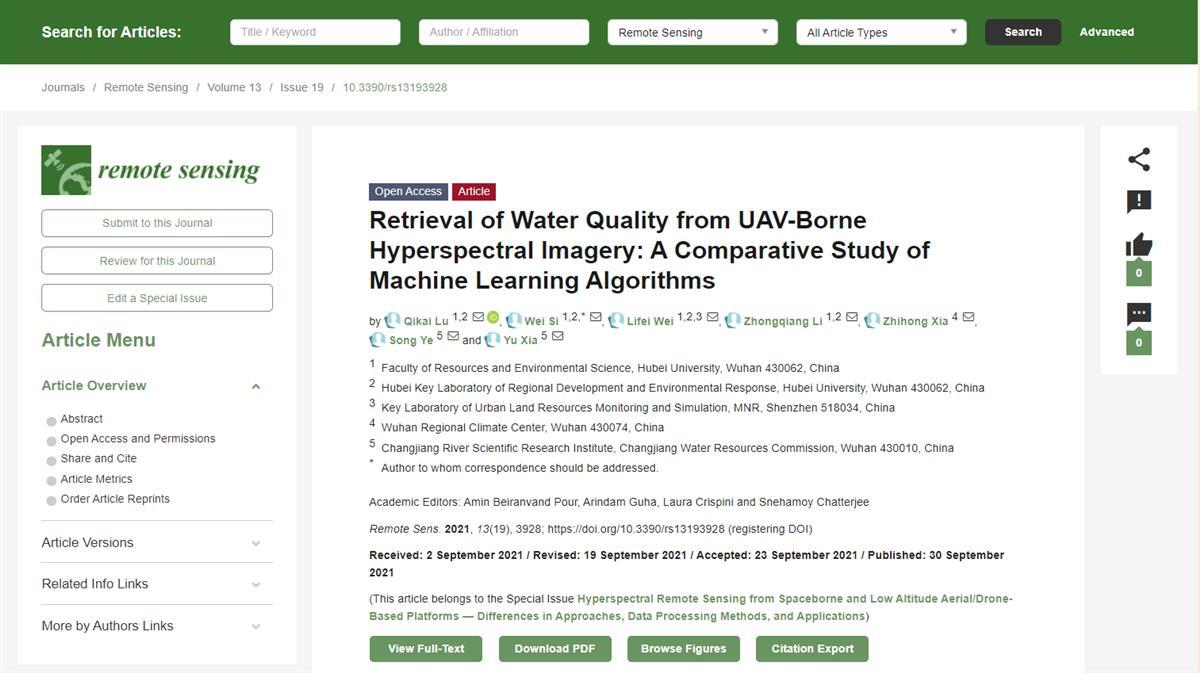 从法律事务跨界地理科学,从懵懵懂懂到走入学术大门,从“论文小白”到发表第一篇SCI期刊论文……近日,在导师魏立飞副教授和卢其楷老师的指导下,英国365上市公司官网资源环境学院2019级地理信息系统专业研究生司维,以通讯作者身份在Remote Sensing(影响因子4.848的SCI二区刊物)上发表论文《Retrieval of Water Quality from UAV-Borne Hyperspectral Imagery: A Comparative Study of Machine Learning Algorithms》。这也是她硕士学业生涯中的第一篇全英论文。
