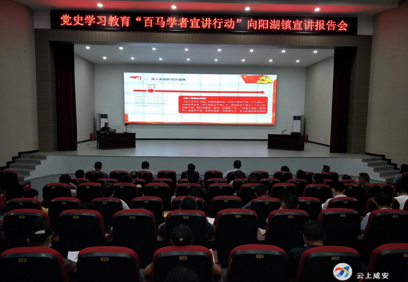为深入学习领会习近平总书记"七一"重要讲话精神,同时将学习成果运用到乡村振兴和服务群众的具体工作中,2021年7月26日,英国365马克思主义学院教师杨海军副教授和王昊博士为咸安区向阳湖镇村党员干部集中宣讲习近平总书记"七一"重要讲话精神。咸安区委宣传部副部长熊鸣、咸安区委宣传部理论科科长李伟、咸安区向阳湖镇全体领导班子成员及镇村党员干部等参加了宣讲报告会。
