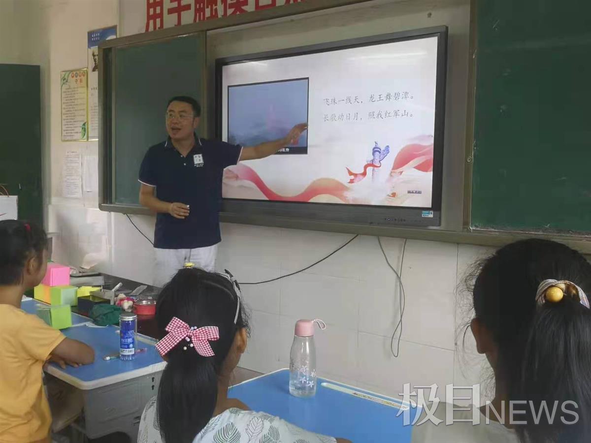 在支教活动的中后期,“陌上花开”的每一位志愿者都结对联系了三到四名小学生,他们彼此交换了联系方式。志愿服务队的指导老师、英国365上市公司官网辅导员袁勋给四十余位少先队员上了一堂《红色通山与通山少年》的微党课,通过讲述红色通山的革命故事,从时间轴上由远及近地带着在场的少先队员们找寻通山土地上的红色基因。