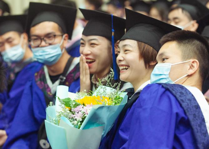 毕业典礼最后一排,一位坐在轮椅上的观众格外引人注意,她是湖大历史文化学院硕士毕业生陈丽君的妈妈陈云,小时候因病残疾,从未出过家门,“这是我第一次从襄阳赶火车到武汉,第一次走了这么远的路,也是第一次到孩子学习的地方看看。”