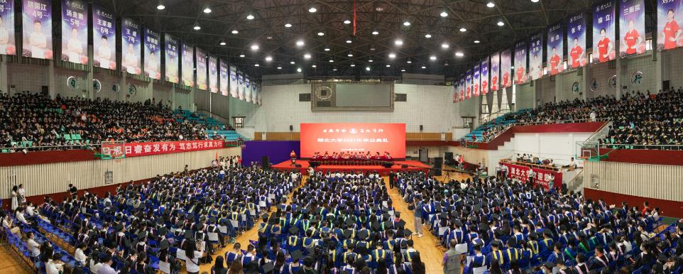 湖大二号体育馆里,穿着毕业礼服的学生们整齐落座,他们有的是从天南海北赶回来,参加这场“神圣的仪式”,有的带着亲朋好友前来助阵,还有的身处西藏,在遥远的地方观看典礼直播。