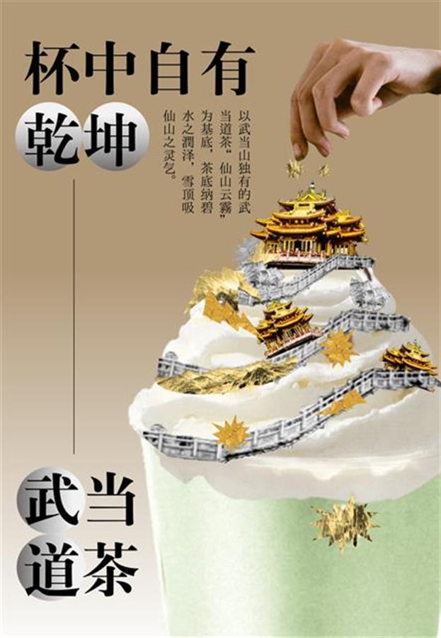 “武当道茶,杯中自有乾坤。雪顶吸仙山之灵气,茶底纳碧水之润泽。”张盛华小组在调查过程中发现,“茶颜悦色”等奶茶文化深受年轻人欢迎,进而联想到将道茶和武当山的形象相结合,打造出一款网红奶茶——“武当道茶”。“我们以武当道茶澄澈醇香为杯底基调,将道茶的奶盖雪顶模拟成武当山的山形,呼应著名景点金顶。”张盛华介绍,拥有丰富茶叶资源的武当山具有得天独厚的优势,他们同样希望化用地域资源优势进行文化传播,带动经济发展。