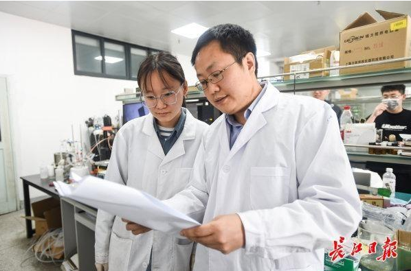 王正帮在实验室与学生研究实验报告。 长江日报记者许魏巍 摄