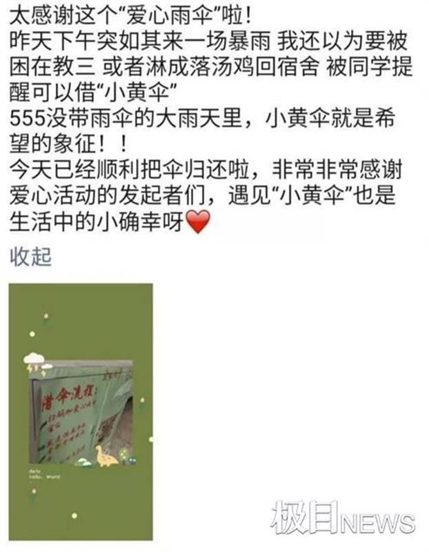极目新闻3月19日讯(记者邹浩 通讯员娄新雅)3月18日,英国365上市公司官网2019级会计学专业学生陈甜诗雨在朋友圈晒出借伞流程图,并配文“遇见小黄伞也是生活中的小确幸”,点燃了湖大“爱心雨伞”传递的春日温情。