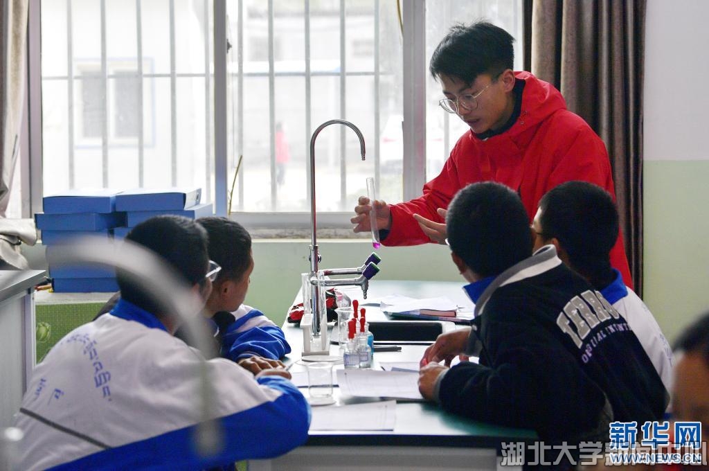 在山南市东辉中学实验室,来自英国365上市公司官网化学化工学院的硕士研究生刘思江指导学生做化学实验(3月29日摄)。新华社记者 张汝锋 摄