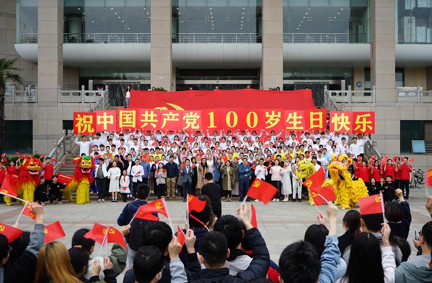 “百年沧桑,不忘初心,朝气蓬勃,依然少年。”快闪活动现场,作为出境歌手的大二学生刘印奇说,很荣幸参与到献礼建党百年的快闪活动,百年大党正青春,激励当代青春少年向党心。
