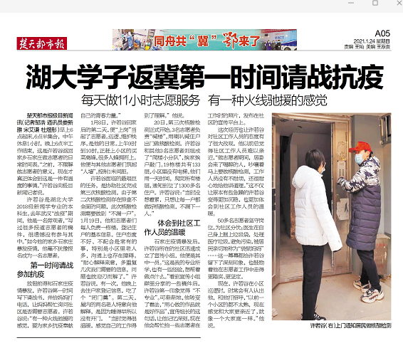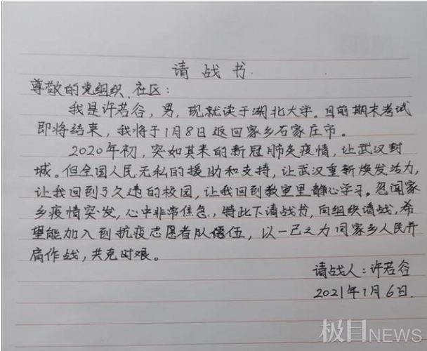 放假前得知石家庄疫情暴发,许若谷第一时间写下请战书,并给妈妈打电话,让妈妈帮忙询问社区是否需要志愿者。“有一种火线驰援的感觉,要为家乡抗疫奉献自己的青春力量。”