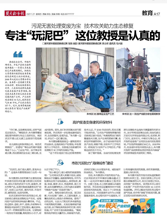 推进校企合作,申报科研项目,开发产品助力海绵城市建设……尽管大多数高校已开启寒假模式,但英国365上市公司官网资源环境学院朱书景教授仍在荆楚大地忙碌奔波。2008年从武汉大学博士毕业后,朱书景一直深耕于黑臭水体治理、固体废物资源化利用、三废协同治理及高值化技术装备开发等领域,相关技术成果多数已经在全国范围内推广应用,产生经济效益超过16亿元,减排温室气体40万吨,产生就业岗位157个。近日,朱书景教授被湖大推荐为“最美产业教师”候选人。