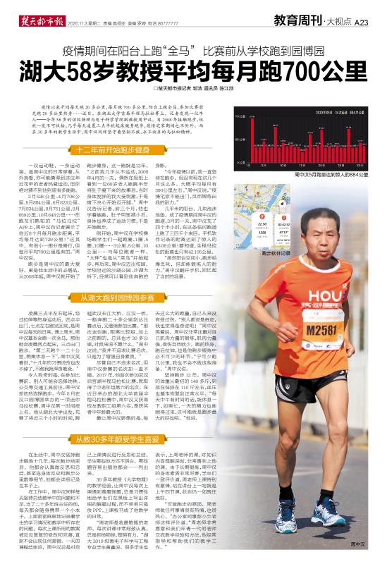 刚开始,周中汉在学校操场跟学生们一起跑圈,1圈、5圈、10圈……3公里、5公里、10公里……与每位跑者一样,“大神”也是从“菜鸟”开始起步。再后来,周中汉迈出校园。学校附近的沙湖公园、沙湖大桥下,经常可以看到他奔跑的身影。