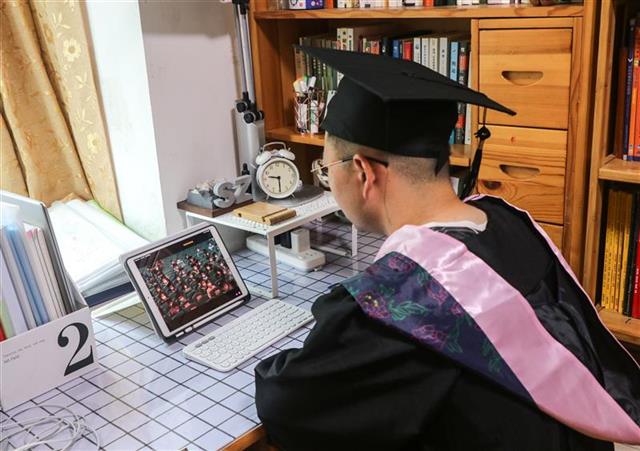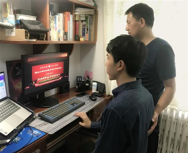 “隔着屏幕观看毕业典礼直播时,大学的四年生活就像电影一般浮现在我的脑海,我会牢记母校‘日思日睿,笃志笃行’的校训,继续谱写自己的人生乐章。”在河南郑州,王晓晨同学和爸爸一起观看了毕业典礼。
