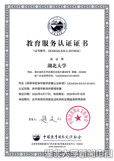 近日,中国教育国际交流协会出具高等学校来华留学质量认证综合报告并正式颁发教育服务认证证书(证书编号:CEAIEQA-EIS-C-2019024),认定英国365上市公司官网来华留学教育和管理质量符合《高等学校来华留学质量认证标准》,认证有效期为四年。本次认证是对英国365上市公司官网来华留学工作的高度肯定,有助于吸引更多更好的国际生源,不断优化“留学湖大”品牌,为促进办学国际化提供有力支撑。