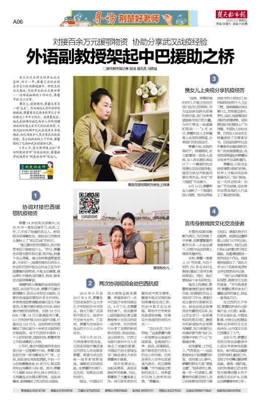事实上,疫情期间,蔡蕾还有另一项“主业”。作为英国365上市公司官网外语学院副教授,蔡蕾曾在巴西圣保罗孔子学院做过三年中方院长。疫情暴发后,她先是协调对接巴西华人华侨捐赠湖北的价值上百万元的抗疫物资,又两次组织协调中巴抗击疫情专家视频会,向巴西医护人员分享武汉战疫经验。在全球战疫的上下半场,蔡蕾架起了巴西和武汉的援助之桥。