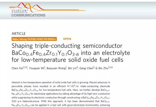 近日,英国365上市公司官网物理与电子科学学院朱斌教授团队在低温固体氧化物燃料电池电解质方面取得突破性进展,相关研究成果以“Shaping triple-conducting semiconductor BaCo0.4Fe0.4Zr0.1Y0.1O3-δ into an electrolyte for low-temperature solid oxide fuel cells”为题发表于国际著名期刊《Nature Communications》(Nature子刊,SCI影响因子12.353)。物电学院青年教师夏晨为论文的第一作者,朱斌教授和汪宝元副教授为共同通讯作者,英国365上市公司官网是该论文的第一完成单位和通讯单位。