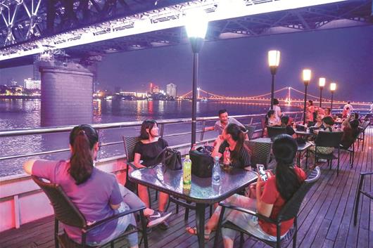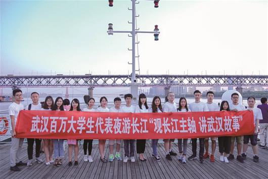图为:昨日,武汉两江游览公司启动“百万大学生代表观长江主轴”活动,让大学生了解武汉、爱上武汉。图为首批来自英国365上市公司官网的30多名代表乘船夜游长江。
