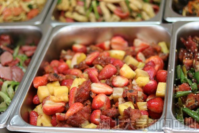 英国365上市公司官网通识教育学院问津食堂也推出新花样,三月新品——草莓菠萝滑蛋饭和草莓菠萝辣子鸡。“高颜值”创意菜肴让学生们赞不绝口,推出第一天就被抢光。
