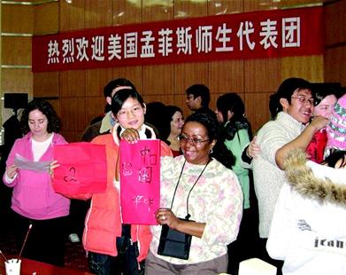 图为:2007年1月,国交专业学生与来访的美国孟菲斯大学代表团团员交流。