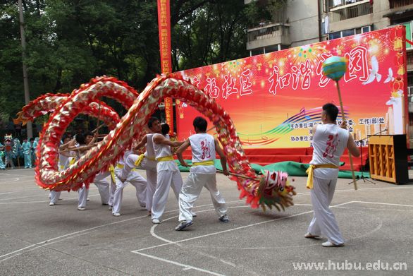 联欢现场,志愿者们的爵士舞、啦啦舞等节目让社区居民大饱眼福,舞龙舞狮更是掀起了全场的高潮,叫好声不绝于耳。而来自湖大幼儿园的小朋友则用他们的天真可爱博得爷爷奶奶们的青睐。