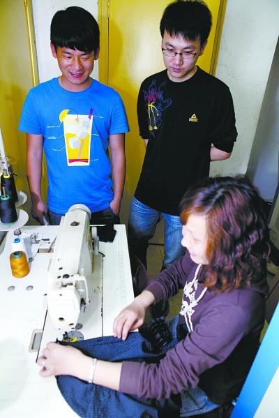 图为李阿姨在帮男生补衣服。