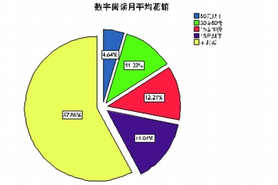 据调查,2012年武汉市民平均每月在书报期刊上的花销为58.2元,其中有11.1%市民基本不购买书报期刊,另有2.8%的市民每月购买书报期刊的花销超过200元。根据《武汉市统计年鉴2011》,2010年武汉市民年人均可支配收入为20806.32元,即人均月可支配收入为1733.3元。而市民每月在书报刊上的花销为58.2元,约占可支配收入的3.4%。