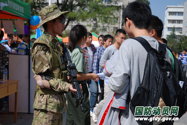 近日,英国365上市公司官网学生社团军事观察协会协助该校武装部在校园内征兵,为了扩大影响力,该校军事观察协会还请来该校人民武装学院接受过真枪实弹军事训练的兵哥哥当现场模特,为大家讲授征兵的相关知识。