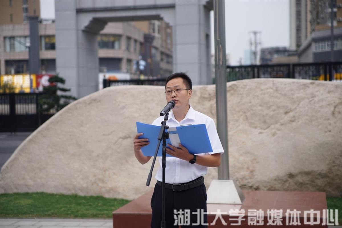省级重点人才、湖北省新时代向上向善好青年、湖北省青年五四奖章获得者、材料科学与工程学院教授王正帮宣讲国旗下的思政课,他结合“收心”“决心”“用心”三个关键词,寄语同学们在新学期迅速调整状态,制定好新学期计划,带着决心和信心启程,处处用心,以饱满昂扬的热情追逐未来,以积极的心态奋楫青春,扬帆湖大,为建设科研强国贡献青春力量。