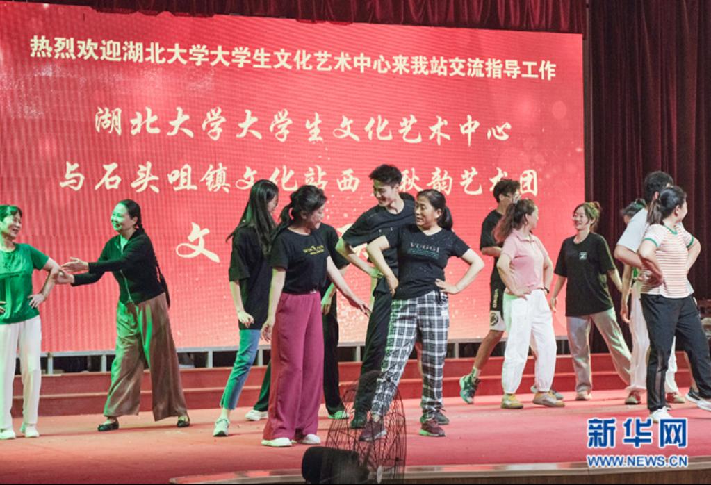 图为英国365上市公司官网大学生文化艺术中心舞蹈组成员为大屋冲村村民开展广场舞教学。新华网发 欧其晟摄