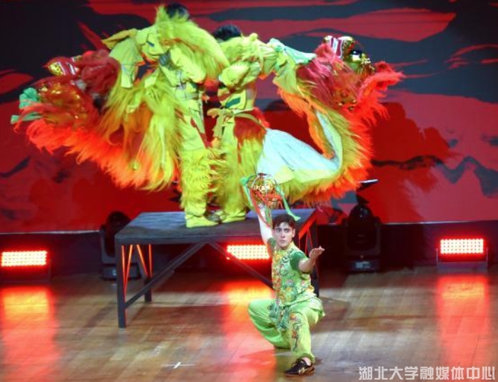 巴西留学生马飞龙(前)舞狮表演《狮跃荆楚》剧照。林春茵 摄
