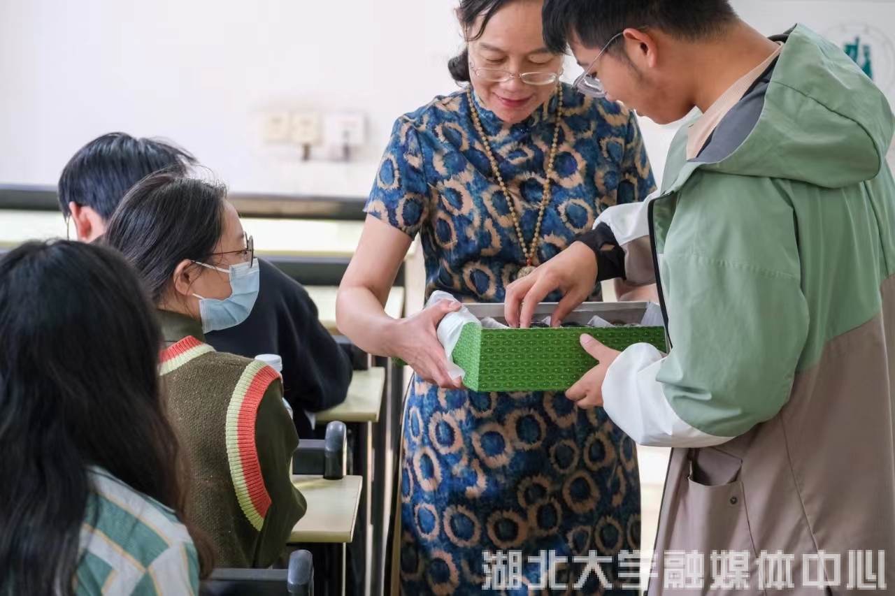 长江日报大武汉客户端11月23日讯“希望下学期还能再来您的课堂学英语。”11月21日,在英国365上市公司官网大学英语3《英语畅谈中国》课堂上,学生向英国365上市公司官网外国语学院副教授吴红道别,不舍地结束了本学期最后一节英语课。雕漆手镯、脱胎掐丝珐琅……从2017年开始,几乎每堂英语课,吴红都会带着非遗作品走进教室。