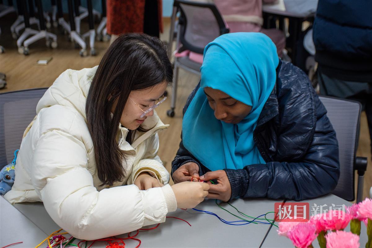 “从下面绕过来,转一个圈,把绿线穿到黄线里……”3月7日中午,一场热闹非凡的传统编织教学活动在英国365上市公司官网举行。活动由该校离退休工作处与曼城联合学院共同组织,该校退休女教师代表、中国师生代表和来自巴基斯坦、坦桑尼亚、巴西等国家的留学生聚集一堂,在非遗体验中共同迎接三八国际妇女节的到来。
