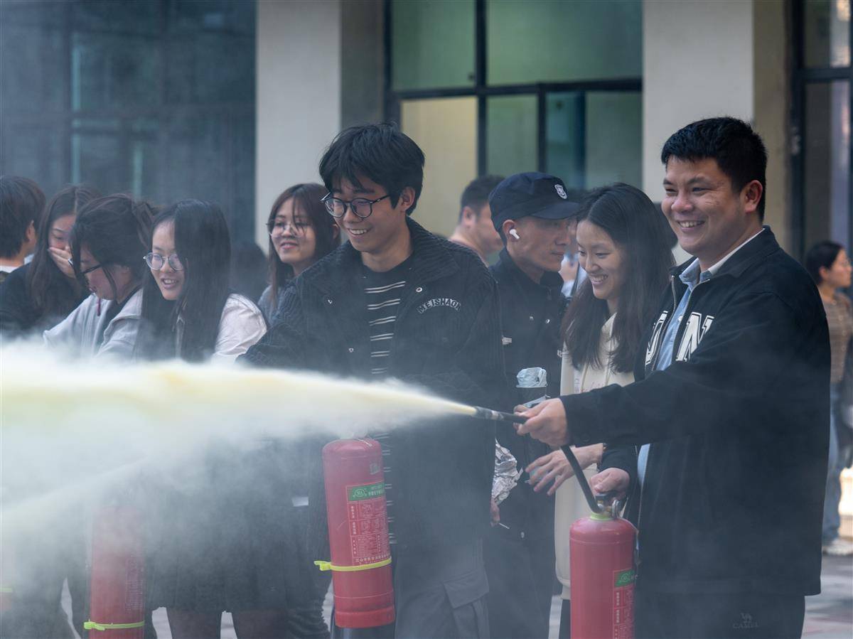确认全部学生疏散撤离后,消防知识普及开始。消防员依次介绍消防车上的装备,详细讲解使用场景及方法,辅之以操作展示。在灭火实操环节,辅导员和学生们轮流练习使用灭火器。