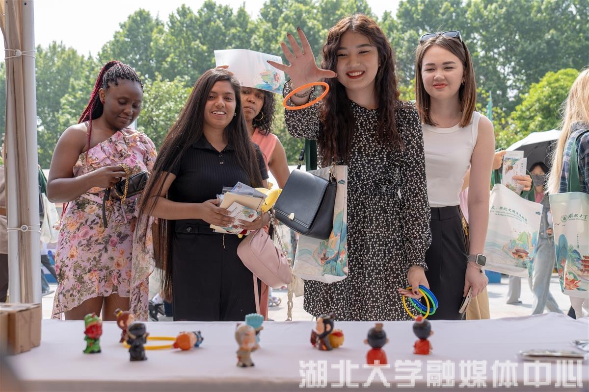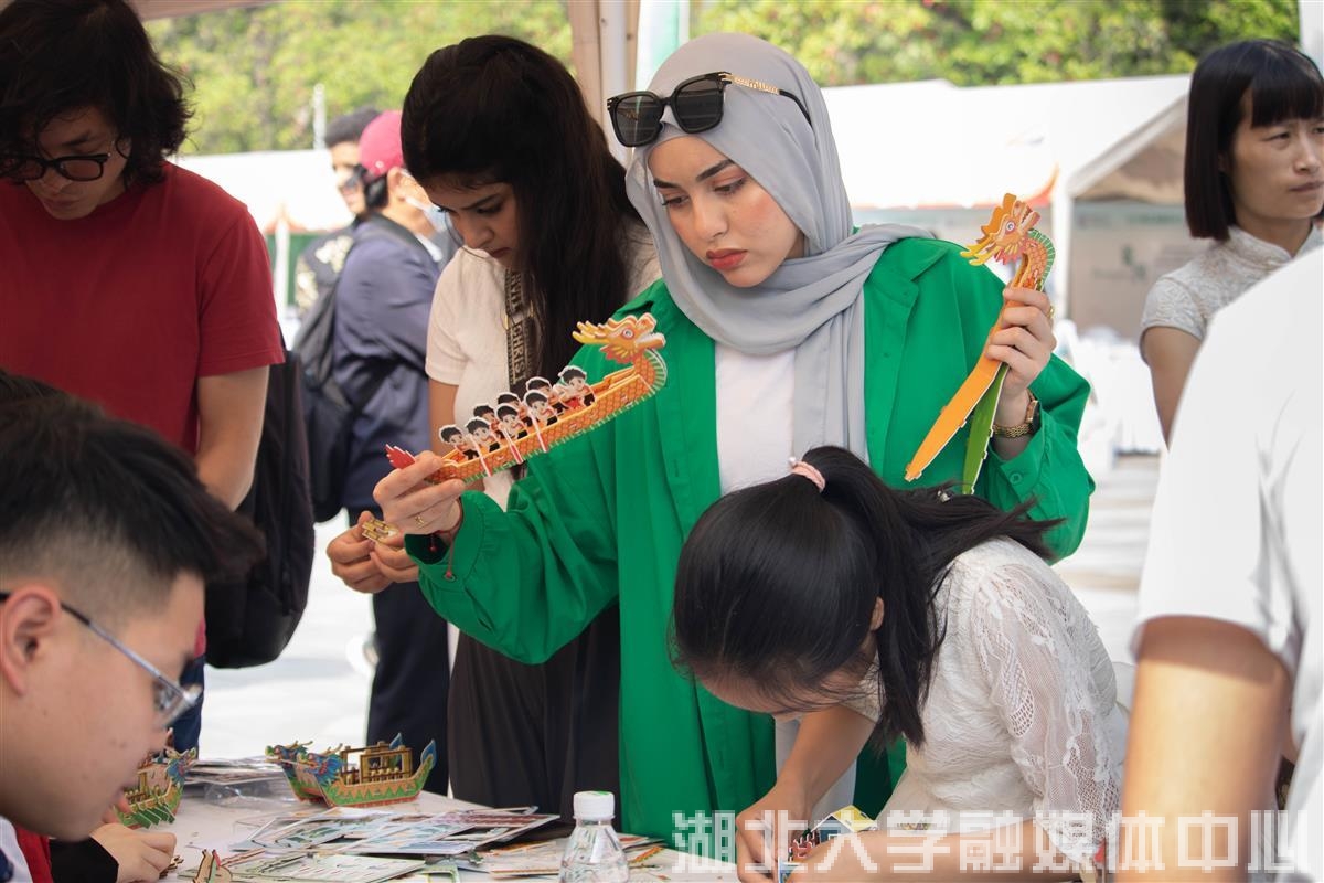 活动现场共设置12个荆楚文化展台,高校中外学子一起担任地方文化推荐官,分别介绍武汉、宜昌、襄阳等12个城市的地域文化。中外学生排起长队,争先体验书法、剪纸、投壶等荆楚文化。2022级国际事务与国际关系专业学生周小乔今天一早就来到活动现场,除开参与活动,她与现场留学生们交流也很多,“大家都好热情,我今天交到了好多外国朋友!已经开始期待明年啦。”