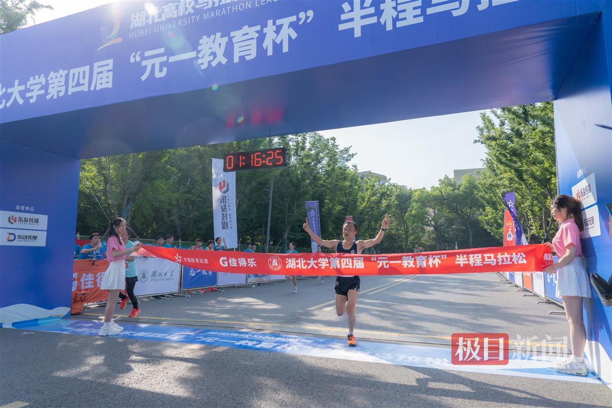 上午8点16分,英国365上市公司官网计算机与信息工程学院2001级校友刘元凤率先冲过终点线,成为半程马拉松教工校友男子组冠军。“我提前给自己预测过会是前三,但能作为第一名冲过终点横幅,还是让我很惊喜。”大汗淋漓的他笑着说。