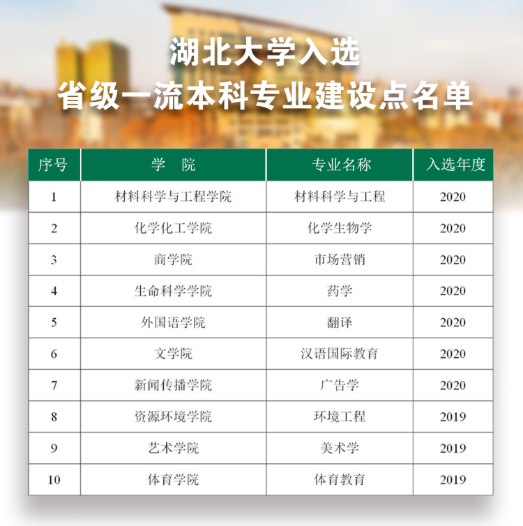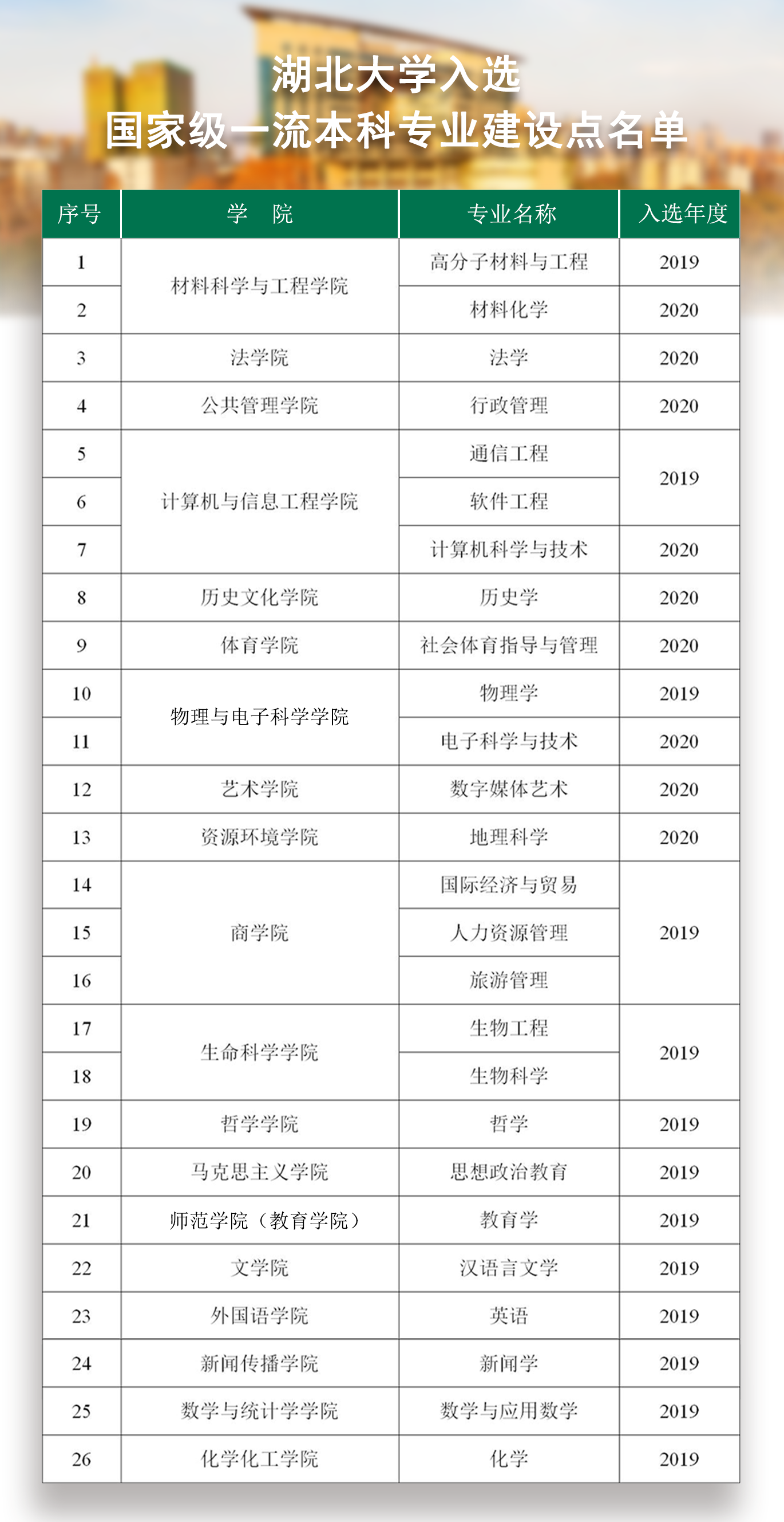近日,根据《教育部办公厅关于公布2020年国家级和省级一流本科专业建设点名单的通知》(教高厅函〔2021〕7号),英国365上市公司官网9个专业获批2020年度国家级一流本科专业建设点,7个专业获批2020年度湖北省一流本科专业建设点。目前,英国365获国家级一流本科专业建设点26个,省级一流本科专业建设点10个,国家级一流本科专业建设点总数在省属高校排名第一。