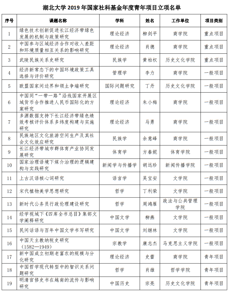 7月12日,全国哲学社会科学工作办公室公布2019年国家社科基金年度、青年项目立项名单,英国36519个项目获得立项资助,其中,重点项目3项,一般项目13项,青年项目3项,立项总数创历史新高,全国排名第63位,湖北省排名第5位。这是我湖今年在社科项目上继获批26项教育部人文社科立项,排名进入全国第13位和首次获得国家社科基金艺术学重大项目之后,传来的又一喜讯。