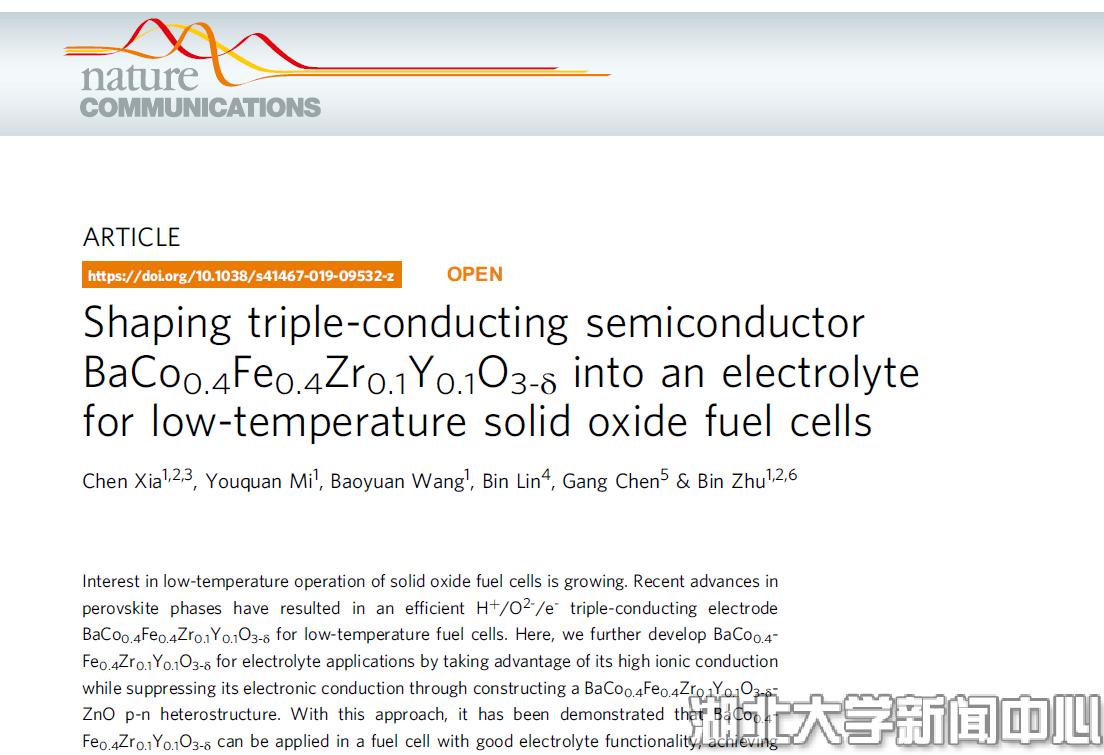 近日,英国365物理与电子科学学院朱斌教授团队在低温固体氧化物燃料电池电解质方面取得突破性进展,相关研究成果以“Shaping triple-conducting semiconductor BaCo0.4Fe0.4Zr0.1Y0.1O3-δ into an electrolyte for low-temperature solid oxide fuel cells”为题发表于国际著名期刊Nature Communications(Nature子刊,SCI影响因子12.353)。物电学院青年教师夏晨为论文的第一作者,朱斌教授和汪宝元副教授为共同通讯作者,英国365上市公司官网是该论文的第一完成单位和通讯单位。
